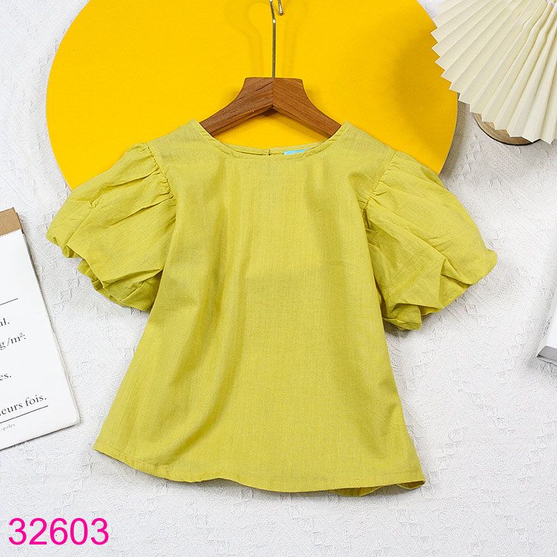 Áo Bé Gái Tay Phồng Cổ Tròn Màu Trơn Xinh Xắn (6 - 11 tuổi)
