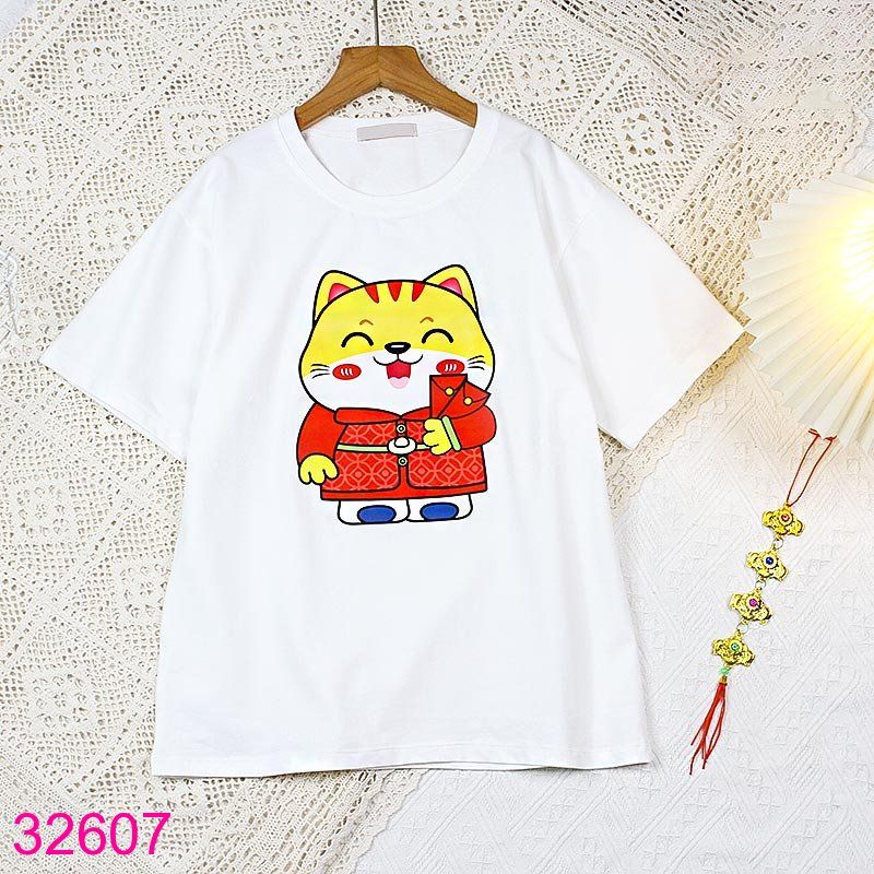 Áo tay ngắn, cổ tròn, mặc rộng, áo in họa tiết mèo, hình in xinh xắn, sản phẩm chi tiết như hình chụp