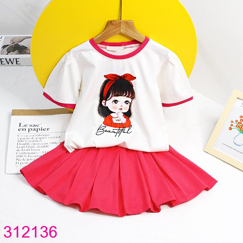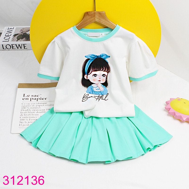 Áo tay ngắn, tay phồng, cổ tròn, áo in hình cô gái dễ thương, chân váy xòe có lót chip bên trong, mặc trên gối, dáng váy vừa không ngắn, sản phẩm chi tiết như hình chụp